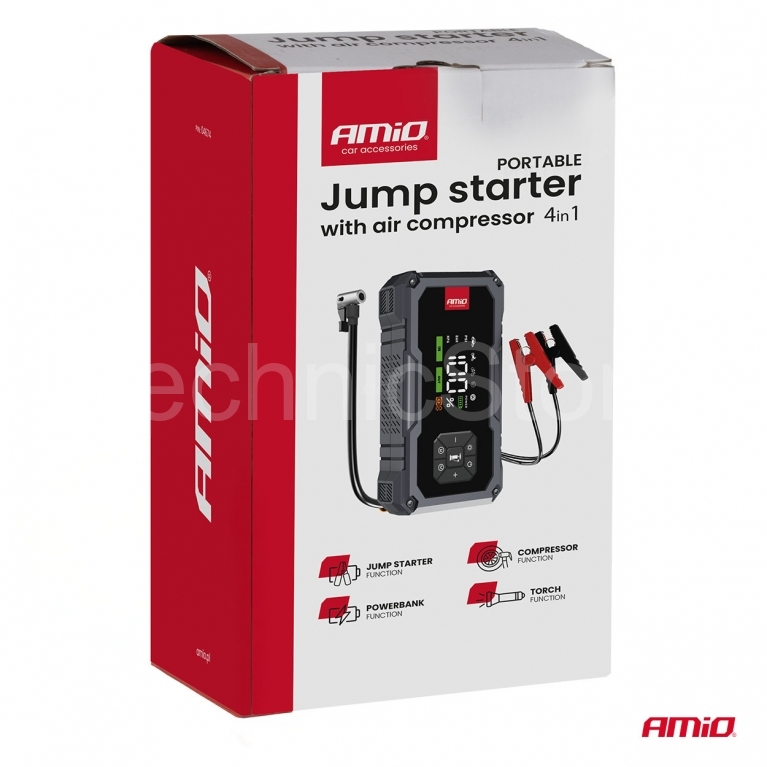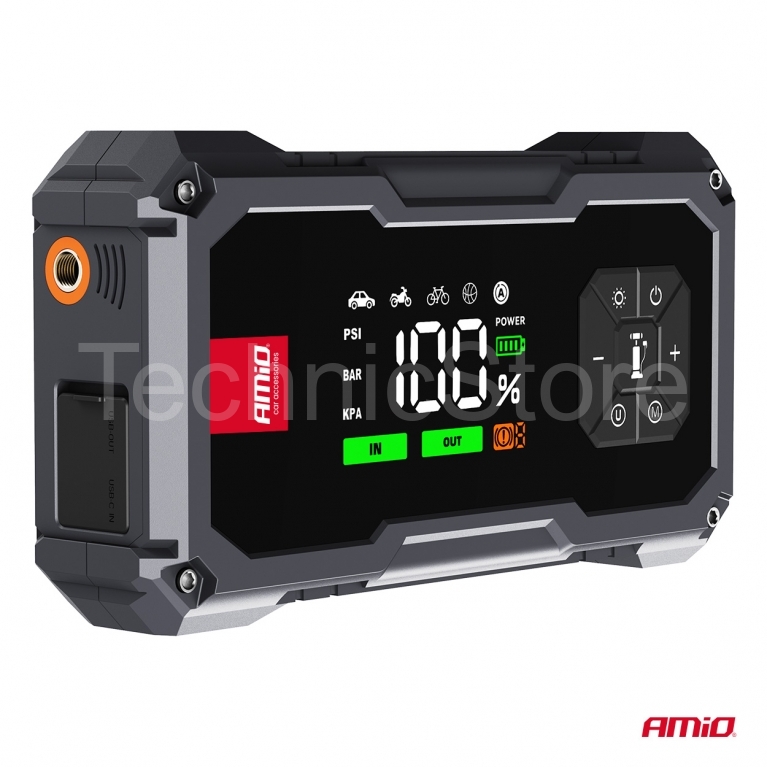 Startovací zařízení AMiO 4 v 1 je multifunkční zařízení určené pro dílny, servisní střediska a individuální uživatele. Kombinuje funkce startovacího adaptéru, vzduchového kompresoru, powerbanky a LED svítilny, což z něj činí spolehlivé řešení pro nouzové situace i každodenní použití.